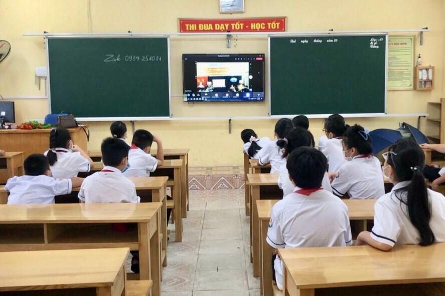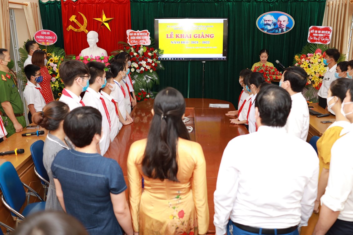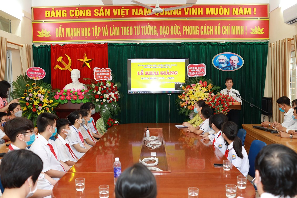 Do diễn biến phức tạp của dịch bệnh Covid-19 tại một số tỉnh thành trong cả nước và điều kiện thời tiết, buổi Lễ khai giảng của nhà trường được tổ chức dưới hai hình thức: trực tiếp và trực tuyến. Cán bộ, giáo viên, nhân viên nhà trường cùng đại diện các em học sinh khối 6 dự khai giảng trực tiếp tại phòng Hội trường, trong các lớp học; Các em học sinh khối 7,8,9 dự khai giảng trực tuyến tại nhà trên phần mềm Microsof Teams.