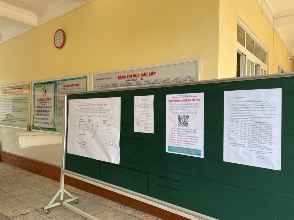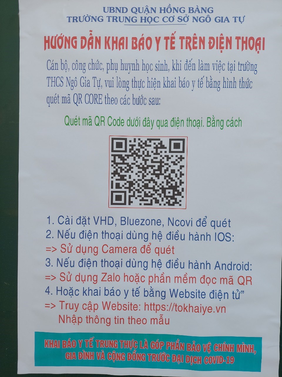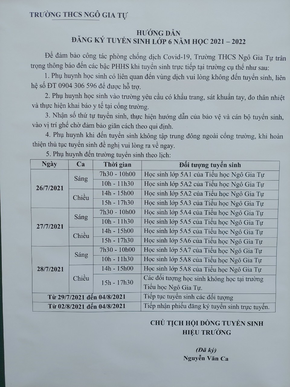 Thực hiện Quyết định số 831/QĐ-UBND ngày 17/06/2021 của UBND Quận Hồng Bàng và Kế hoạch số 19/KH-THCSNGT ngày 22/06/2021 của trường THCS Ngô Gia Tự, sáng ngày 26/07/2021, trường THCS Ngô Gia Tự tổ chức Tuyển sinh lớp 6 năm học 2021-2022. Được sự chỉ đạo, nhất trí của UBND Quận, Phòng GD&ĐT Quận, đây là năm học đầu tiên nhà trường tuyển sinh đầu cấp phối kết hợp hai hình thức: tuyển sinh trực tiếp và tuyển sinh trực tuyến. Trước diễn biến phức tạp của dịch bệnh Covid-19, nhà trường đã tiến hành phun khử khuẩn toàn bộ các phòng học, hành lang, sân trường..., yêu cầu PHHS tham gia đăng kí, nộp hồ sơ cho con em mình phải thực hiện nghiêm túc quy định 5K của Bộ y tế và nội dung các quy định trong Công văn số 4958/UBND-VX ngày 24 tháng 07 năm 2021 của UBND Thành phố Hải Phòng về việc tăng cường một số biện pháp cấp bách trong phòng chống dịch COVID-19. Để đảm bảo điều kiện giãn cách, không tập trung đông người, nhà trường đã thông báo lịch cụ thể cho từng nhóm đối tượng đến trường nộp hồ sơ. Phụ huynh học sinh vào trường yêu cầu có khẩu trang, sát khuẩn tay, đo thân nhiệt, được bộ phận tuyển sinh hướng dẫn đảm thực hiện khai báo y tế tại cổng trường (Quét mã QR CORE). Nhà trường bố trí 02 phòng chờ sạch sẽ, thoáng mát cho PHHS. Trước khi vào nộp hồ sơ, phụ huynh được phát số thứ tự nộp hồ sơ theo quy định. Phòng tuyển sinh được kê bàn ghế đảm bảo khoảng cách, trang bị tấm chắn giọt bắn để giảm thiểu tối đa sự tiếp xúc trực tiếp giữa bộ phận tuyển sinh và PHHS.